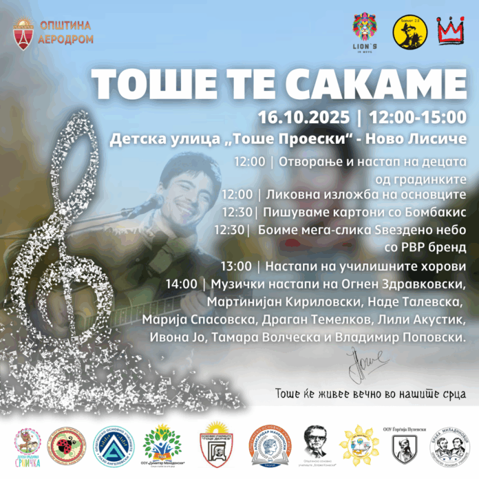 „Овој настан е искрена почит и сеќавање на човекот кој остави траен белег во македонските музика и култура. Целта е да се испрати порака дека Тоше сè уште живее во нашите срца, а неговите музика и хуманост остануваат безвременски симбол на добрината, љубовта и единството“, велат од Општина Аеродром, која го организира настанот во соработка со општинските градинки и училишта.