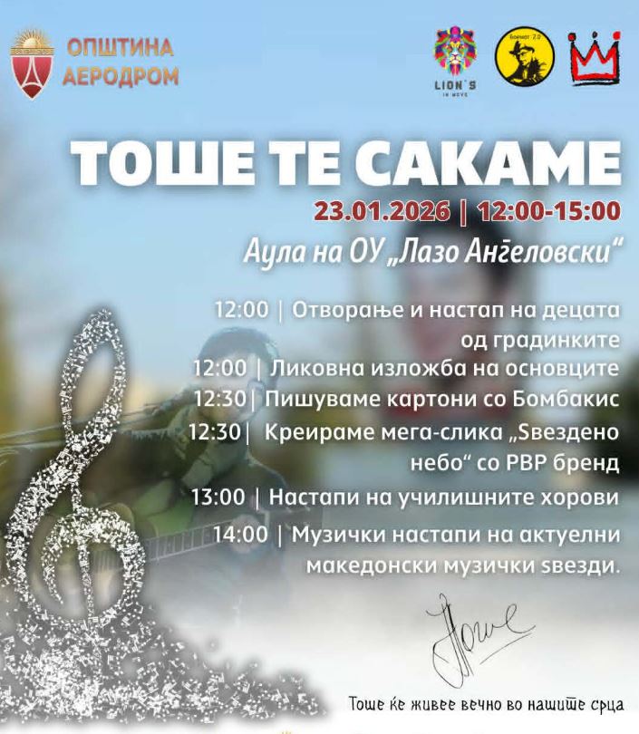 Утре, во периодот од 12:00 до 15:00 часот, во аулата на ООУ „Лазо Ангеловски“ во Ново Лисиче, ќе се одржи забавниот културно-уметнички настан „Тоше, те сакаме“, посветен на ликот и делото на Тоше Проески.