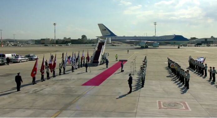 Пристигнувањето на Трамп се одвиваше со висок протокол, црвен тепих и знамињата на САД и Израел.