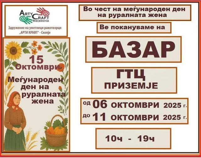 МАКЕДОНИЈА ВО ПРИЗЕМЈЕТО НА ГТЦ – Базар во чест на руралната жена Од страна на Вечер - 05/10/2025 14:56 43 FacebookTwitterPinterestWhatsAppLinkedinEmailTelegramViber Здружението на уметници ракотворци „Арти крафт“ организира базар во приземјето на Градскиот трговски центар, во чест на Меѓународниот ден на руралната жена. Базарот ќе започне утре и ќе трае до 11 октомври, од 10:00 до 19:00 часот. ИЗДВОЕНИНИКОГАШ НЕ Е ДОЦНА НИ ЗА ВЛЕЗ ВО ПОЛИТИКАТА: На 97 години и на 81 година во трка за советничко место – најстарите кандидати на локалните избори05/10/2025 16:06Се вжештува конкуренцијата кај нискобуџетните летови – банкрот на малите и на средните авиокомпании?05/10/2025 15:34Во Скопје остана да се спасуваат само 15 %, сè друго е асфалт, бетон и пластика05/10/2025 14:50Евтина мода со висока цена – токсични хемикалии во облеката и накитот од Тему, Шеин, Али Експрес…05/10/2025 14:30
