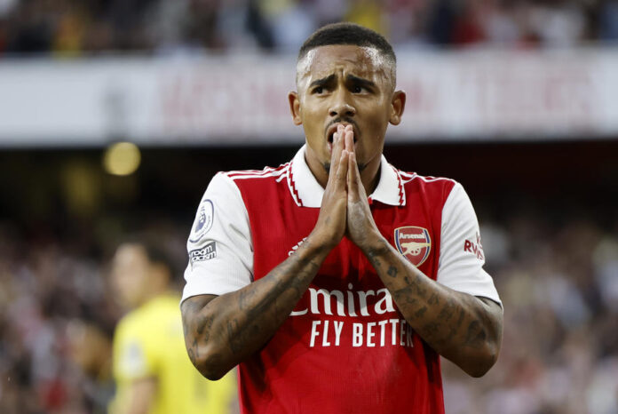 epa10150347 Gabriel Jesus of Arsenal FC reacts during the English Premier League soccer match between Arsenal FC and Aston Villa in London, Britain, 31 August 2022. EPA-EFE/TOLGA AKMEN EDITORIAL USE ONLY. No use with unauthorized audio, video, data, fixture lists, club/league logos or 'live' services. Online in-match use limited to 120 images, no video emulation. No use in betting, games or single club/league/player publications